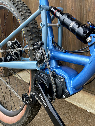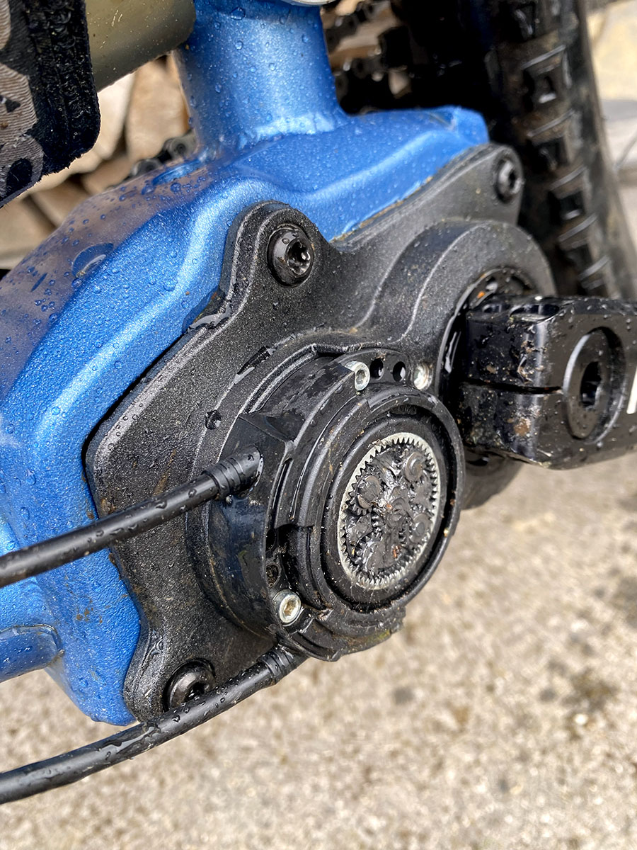 Cependant tout ce poids se retrouve centré entre les pieds. Aucune masse supplémentaire en rotation, même l’économie de la cassette de ce point de vue (les cassettes 11/12vit. avec pignons de 50/52 créent une inertie non négligeable), et pas mal de masses "suspendues" supprimées rendant la suspension plus libre et sensible. S’ajoute à ceci un "effet VAE" dans la sensation de ride, de vélo qui colle un peu mieux au sol et dont les suspensions ont l’air un peu "forcées" de fonctionner, mieux que son équivalent plus léger en transmission classique.