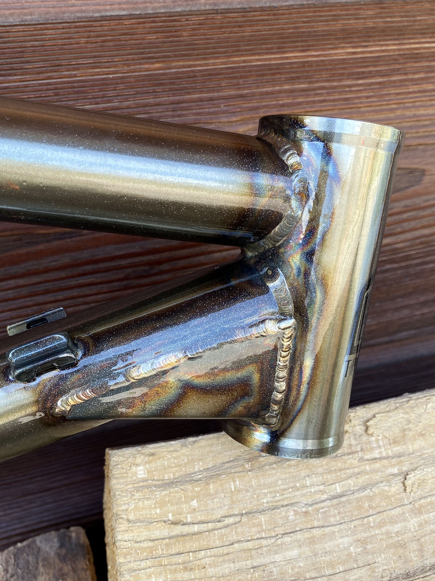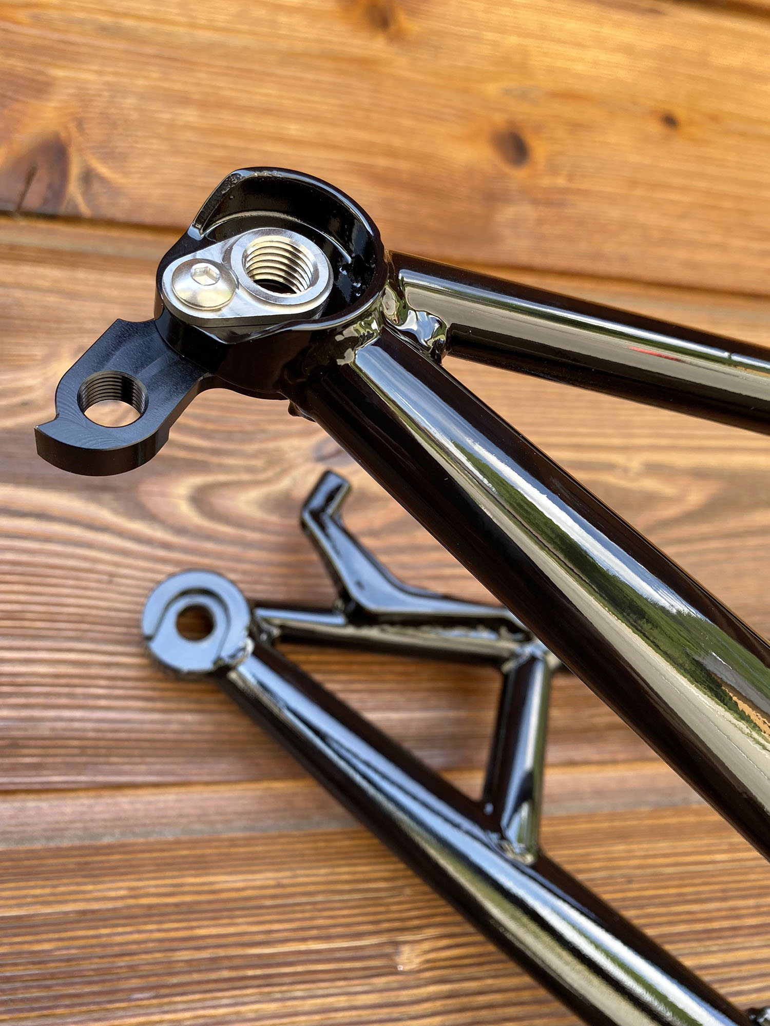 Triangle arrière noir brillant, et triangle avant brut vernis + vernis pailleté métal.