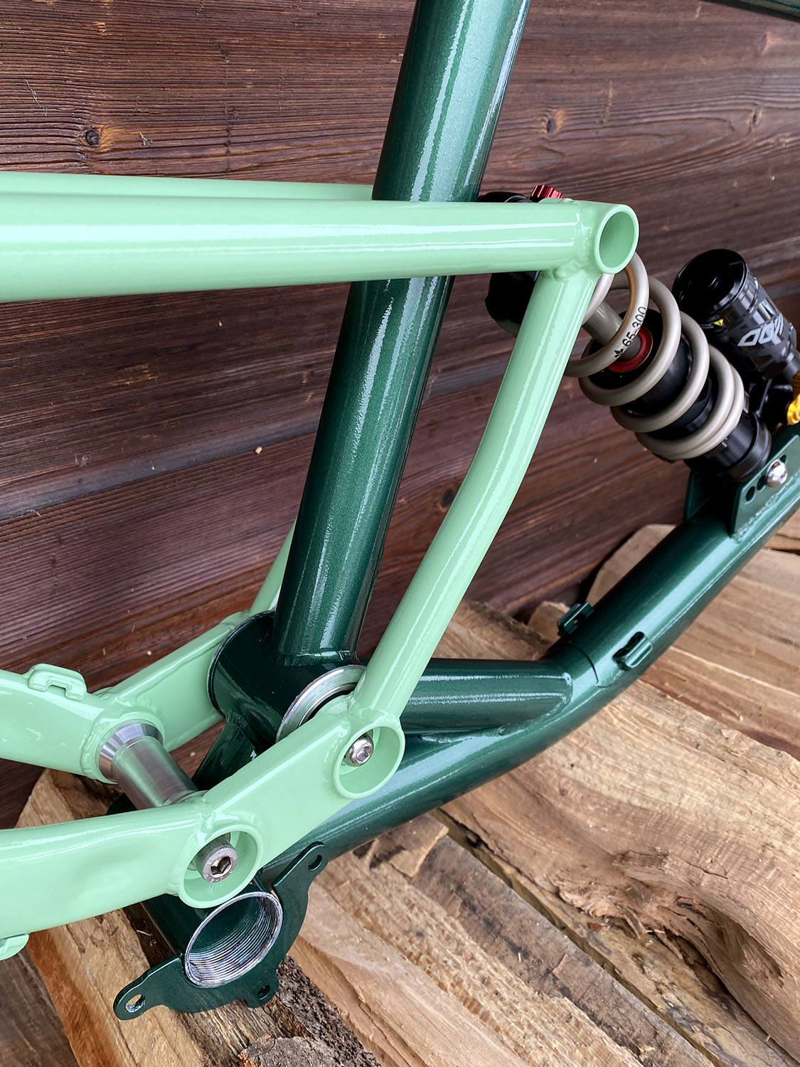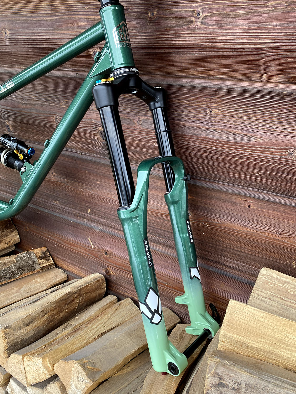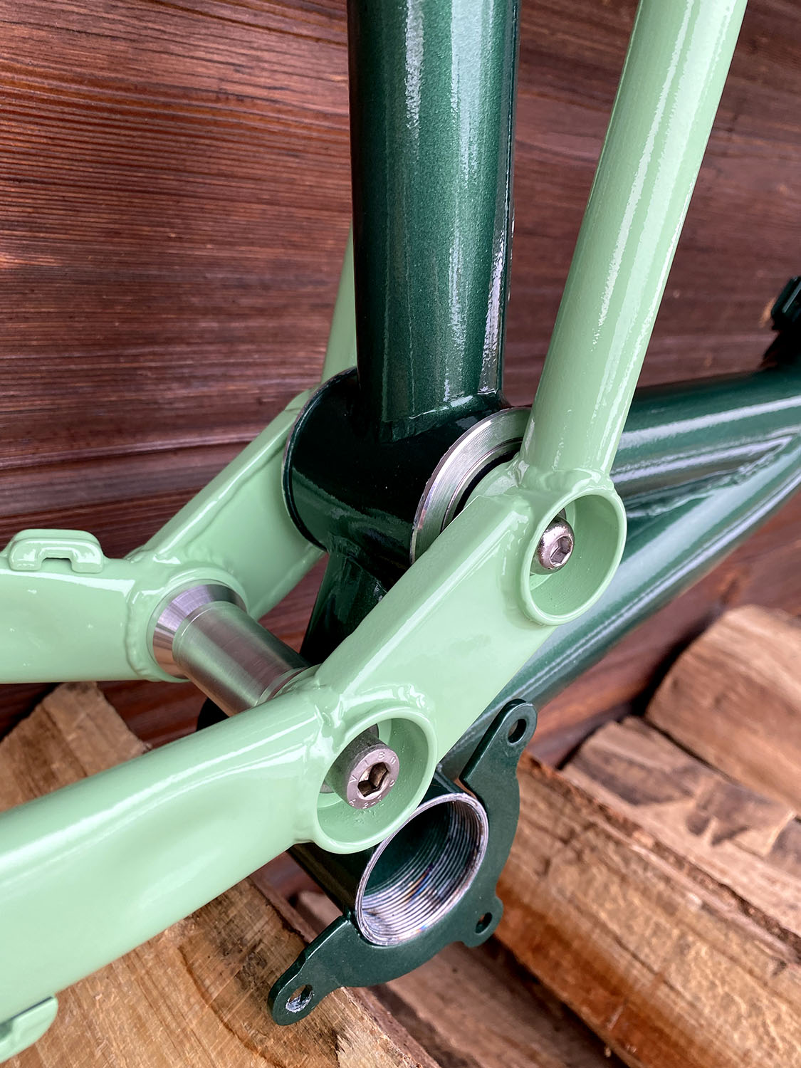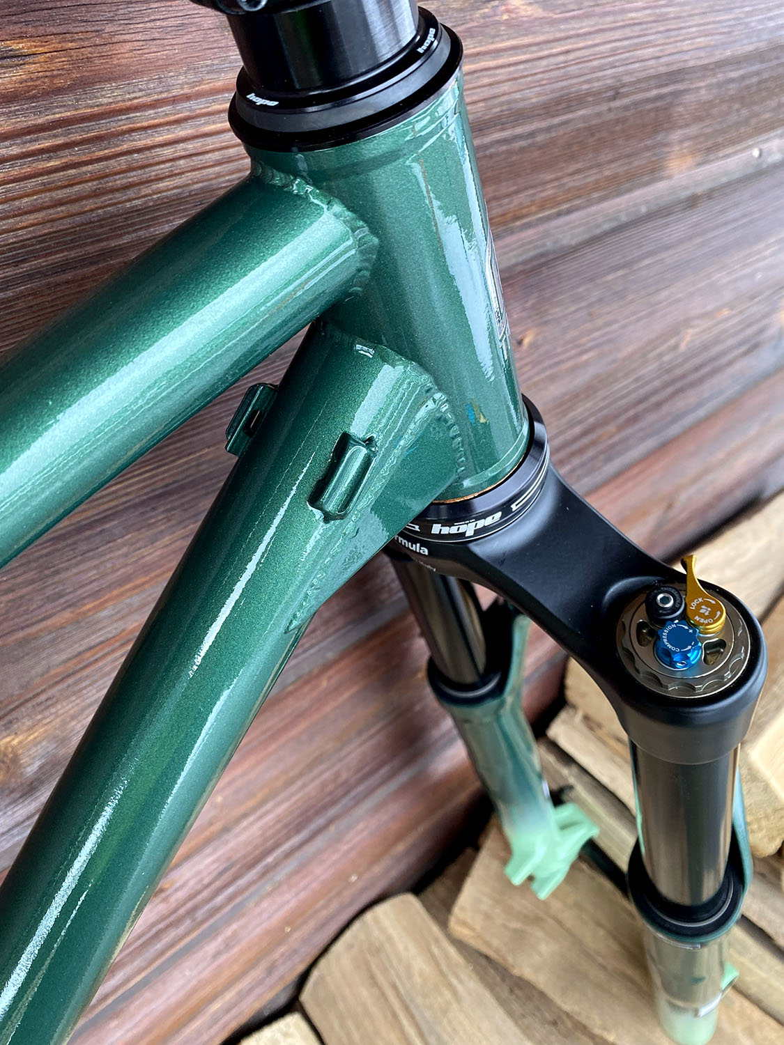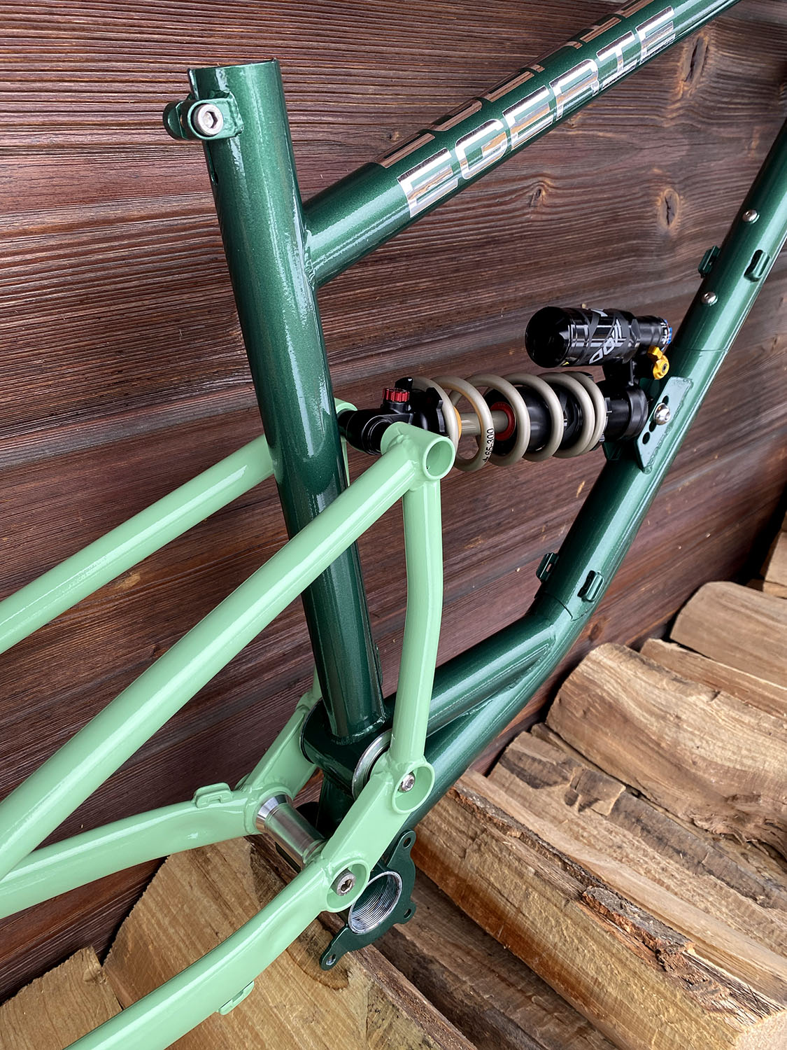 Géométrie sur mesure, peinture vert métallisé + vert clair avec fourche assortie