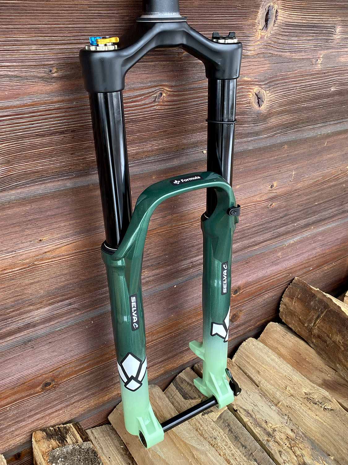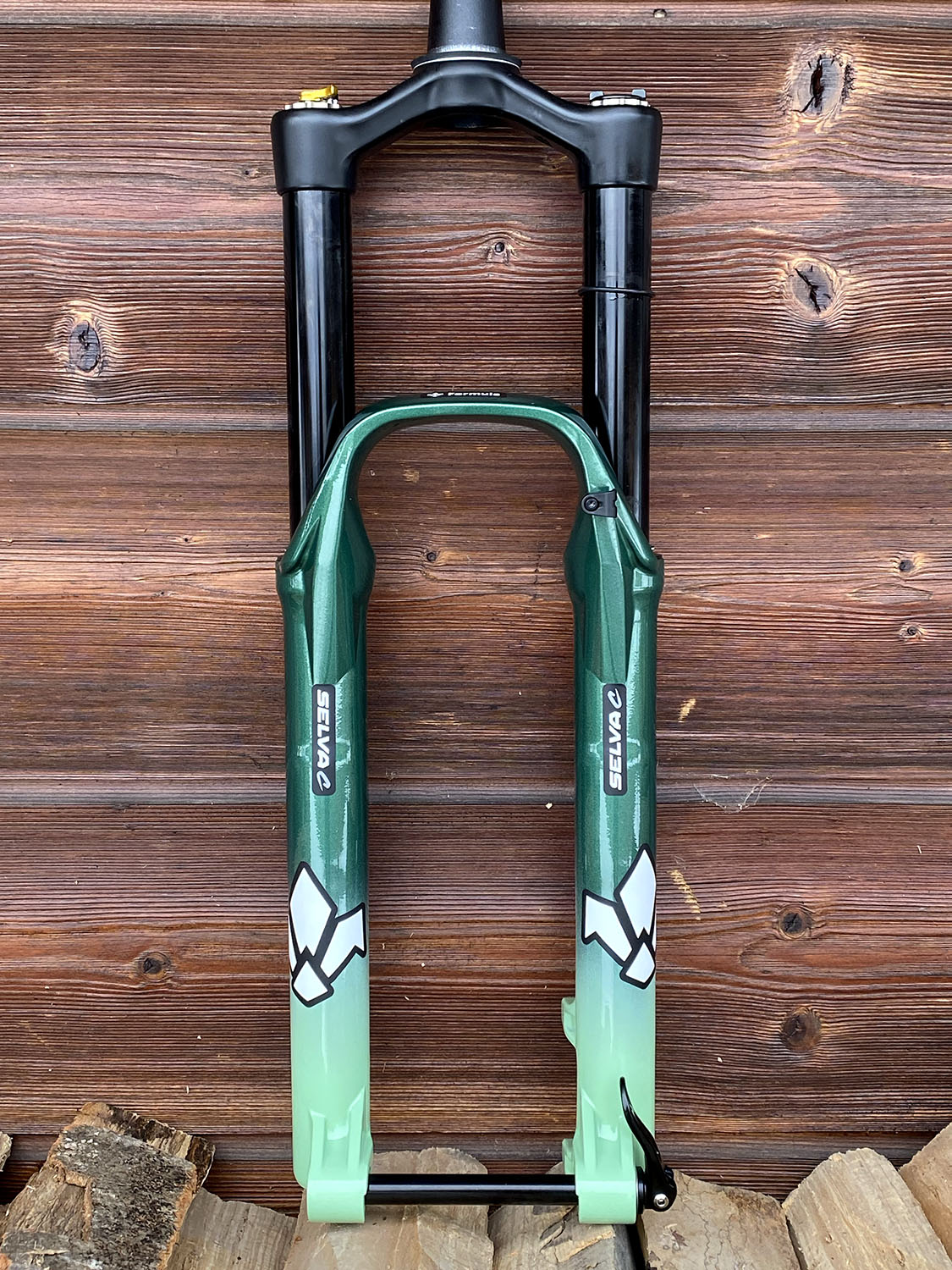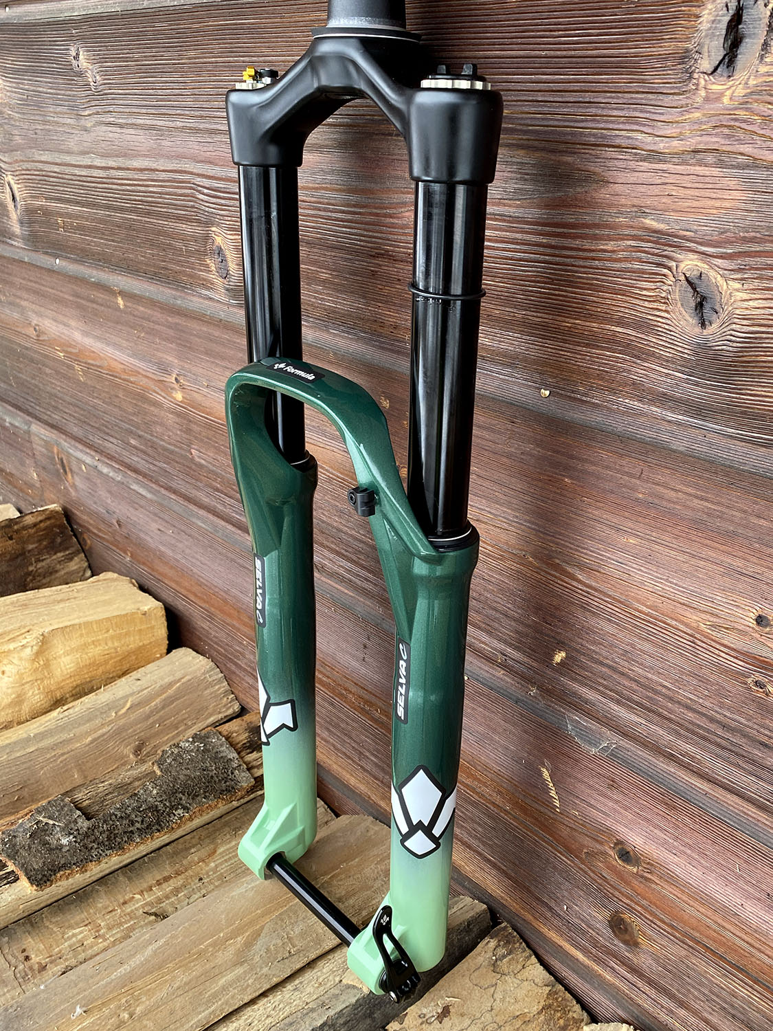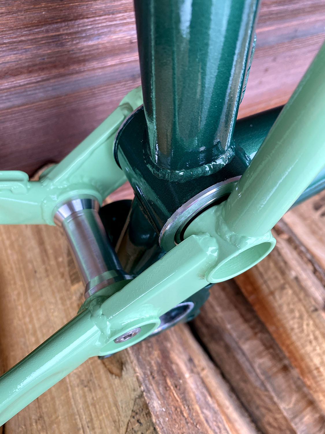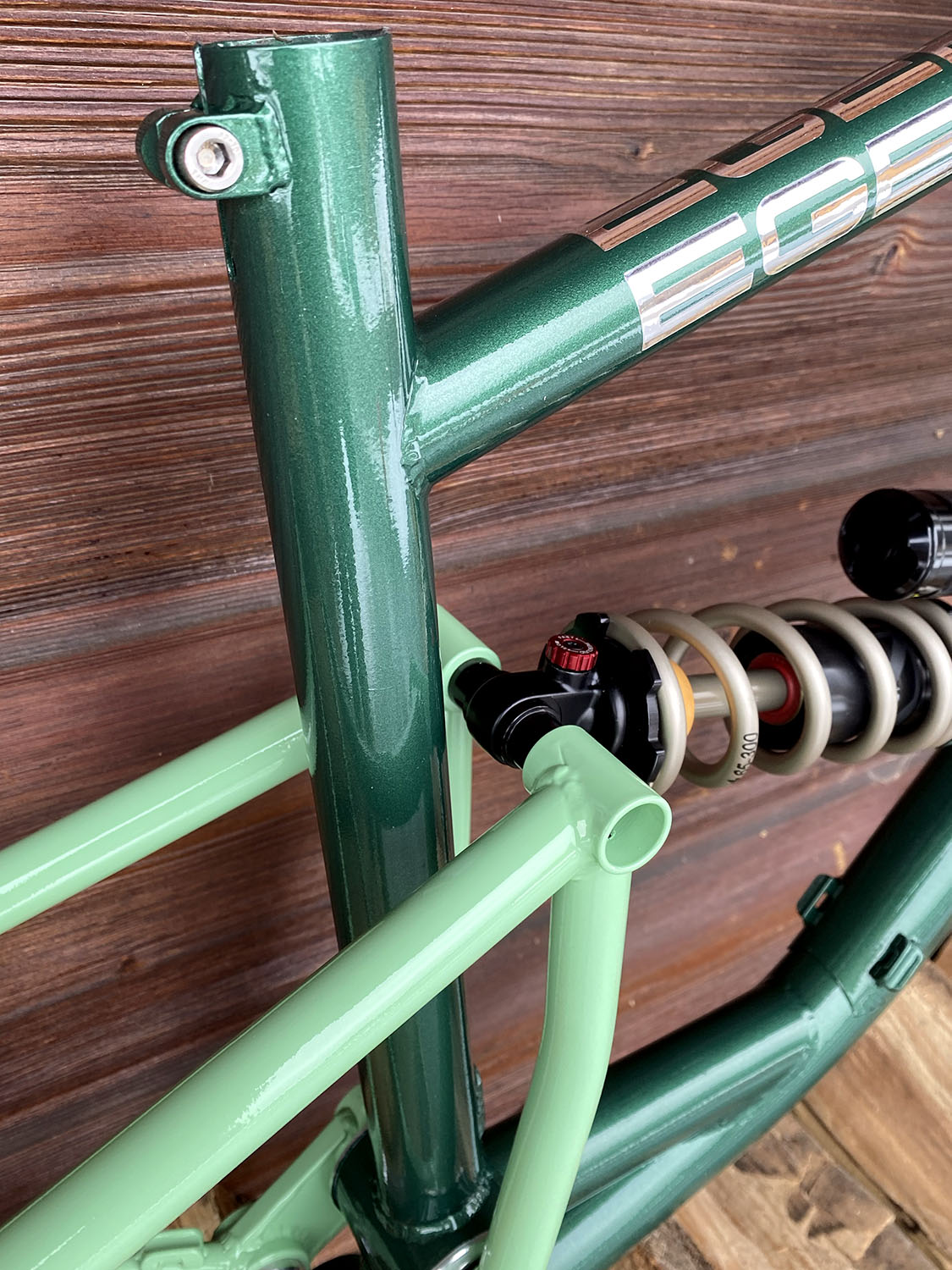 Géométrie sur mesure, peinture vert métallisé + vert clair avec fourche assortie